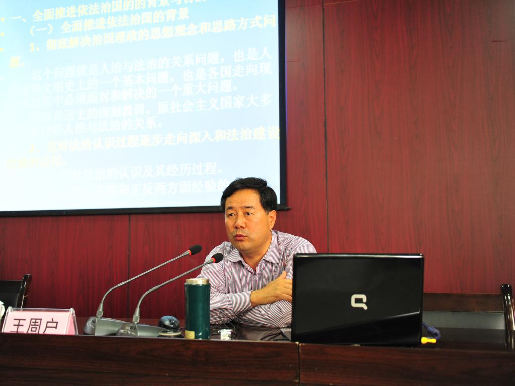 报告会上,王周户教授以贯彻党的十八届三中、四中全会精神、加强法治政府建设为主题,通过详实的资料、生动的案例,从全面推进依法治国的背景和目标,全面推进依法治国的思路和方向,全面推进依法治国的途径和举措等三个方面作了系统的诠释。特别是从科学定位政府职能、健全依法决策机制、深化行政执法体制改革、坚持严格规范执法行为、强化对行政权力的制约和监督、全面推进政务公开等六个方面,对全面推进依法行政和加快建设法治政府的任务和举措做了详细而全面的解读。